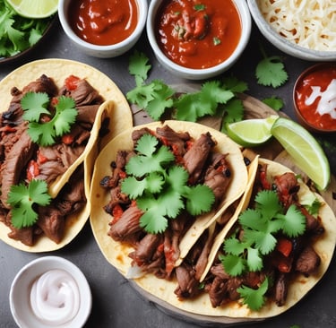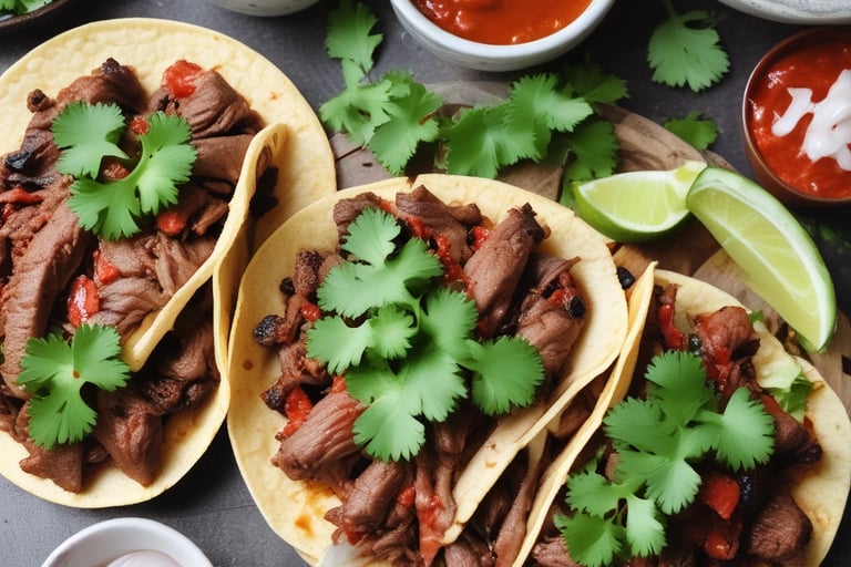 Arma los tacos colocando la carne en las tortillas y guarneciendo con cebolla, cilantro y un chorrito de limón.